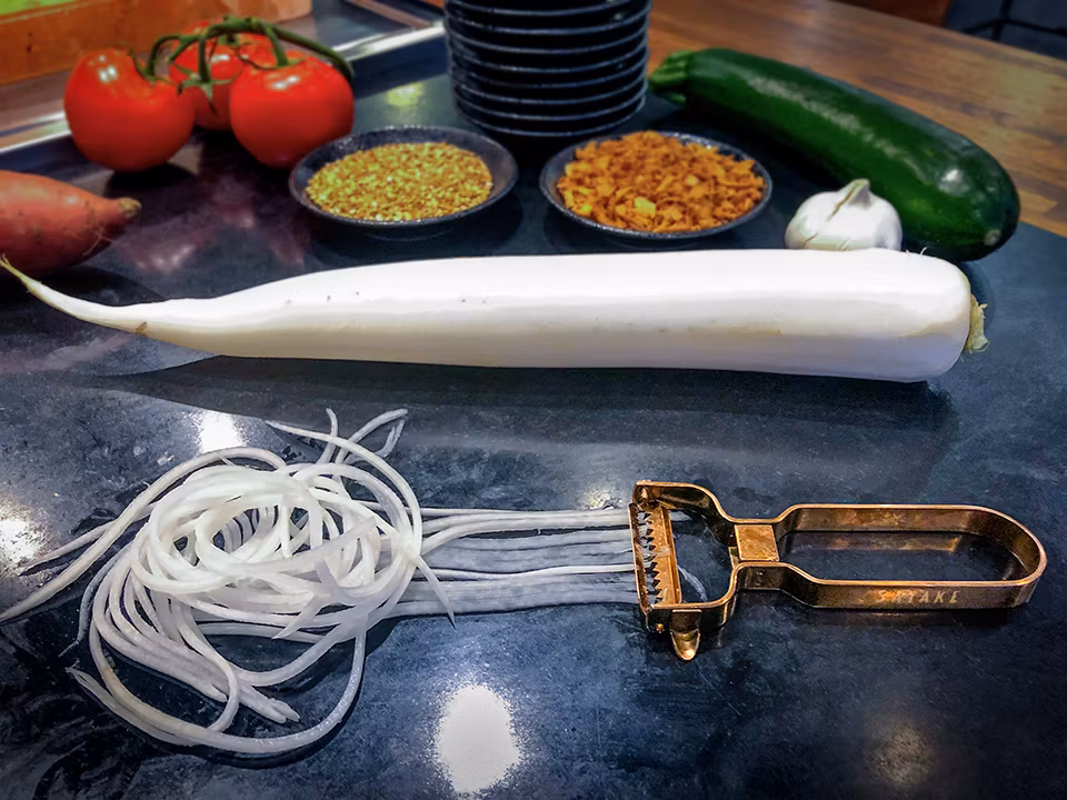 Perfekt redskap för vegetariska rätter. Smidigt verktyg för vegetarisk pasta, en skål rårivet och effektfulla garnityrer.
