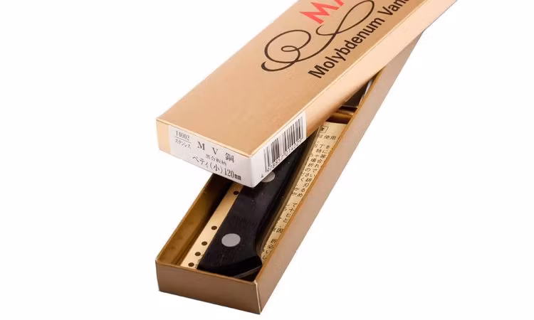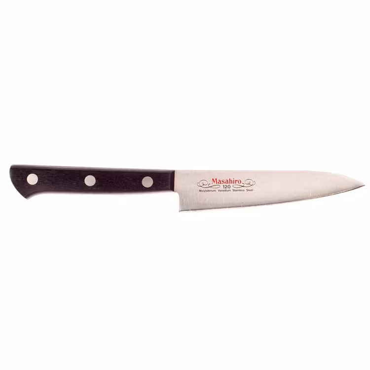 An utility knife is a knife that lies between a chef's knife and a peel ing knife in size, normally 12 to 16 cm in length. Suitable for most types of work tasks in the kitchen. This model from Masahiro is made of Masahiro's own patented steel MBS-26. The knife blade is manufactured through a complicated process in three phases, which results in a perfect hardness (HRC 58-59). Each knife blade is sharpened to perfection by craftsmen with more than 30 years of experience. The shaft / handle is made of black packing wood which is hygienic and remarkably durable.