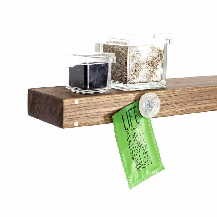 Raw Magnetisk är en flytande plankhylla i amerikansk valnöt med mässingsdetaljer på framsidan, som var och en vid sitt möte markerar hyllan.