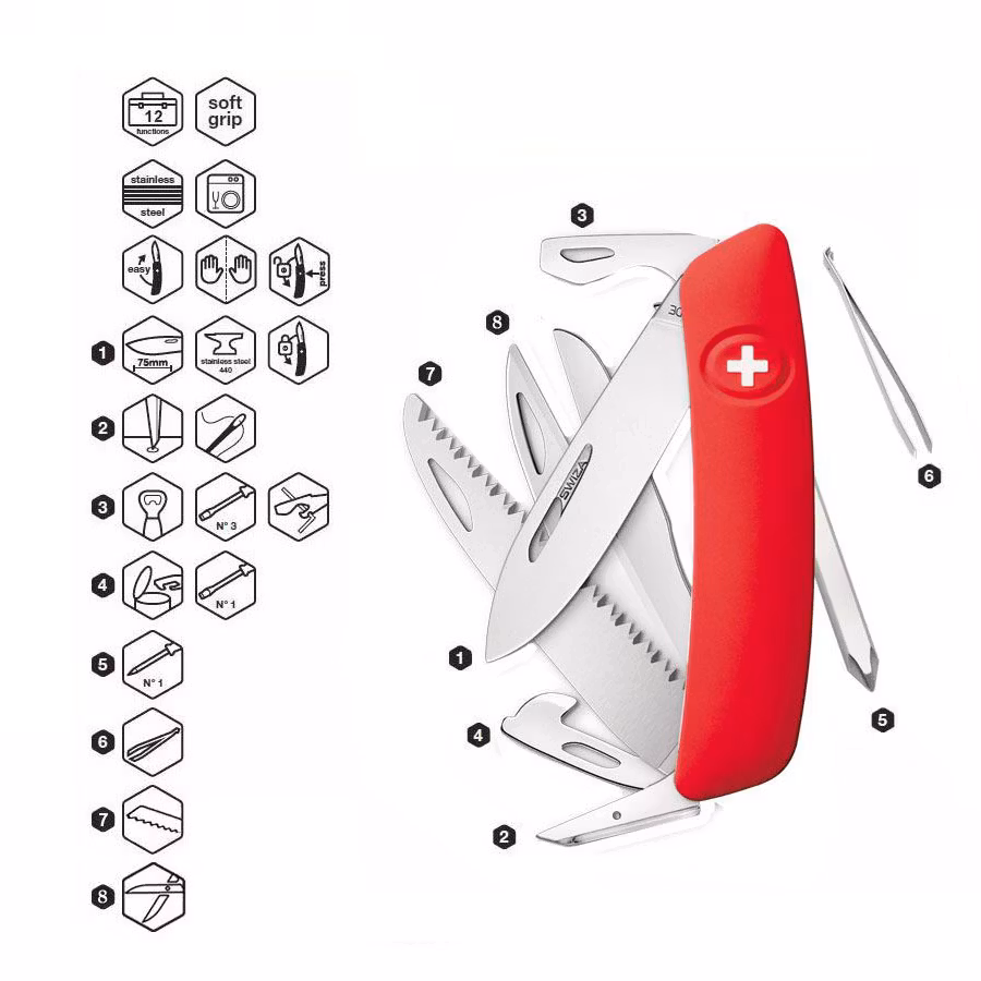 SWIZA® D10 Authentic Swiss Knife, är en fickkniv tillverkat i Schweiz med säkert grepp och mjuka handtag som ligger bekvämt i handen. Den ergonomiska böjda designen gör verktygen mer tillgängliga och tumhålen gör det lätt att öppna för både vänsterhänta och högerhänta. Knivbladet är låsbart för att förhindra stängning unde arbete. Bladet kan låsas upp genom att trycka på SWIZA-korset.