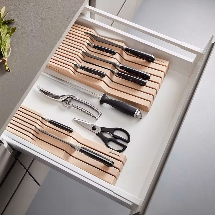 Knivblock för säker förvaring av dina köksknivar i kökslådan. Kapacitet för 15 knivar; 7 stora och 8 små.