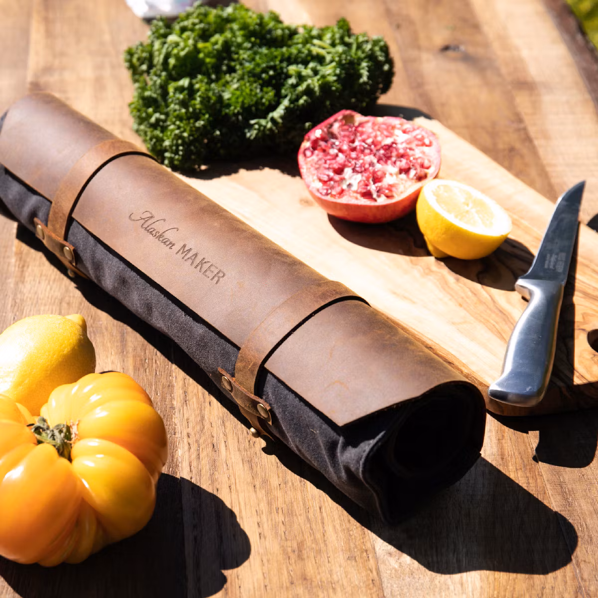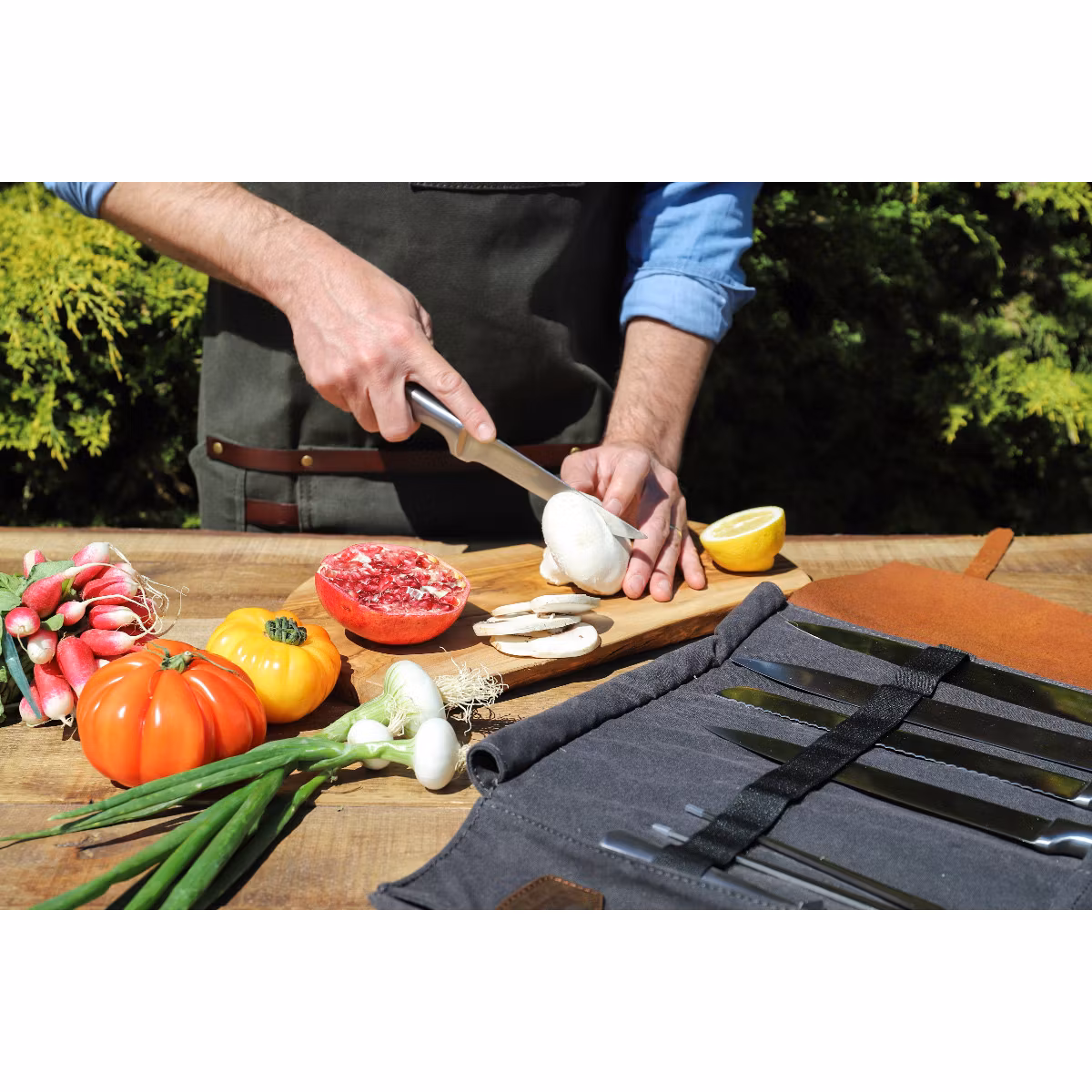 Detta är en knivrulle som ser fantastisk ut får dig att vilja laga mat. Den vaxade duken ger produkten ett elegant och modernt utseende. Stängklaffen och de justerbara banden är gjorda av äkta läder, vilket ger den vintage touch som bidrar till dess charm.