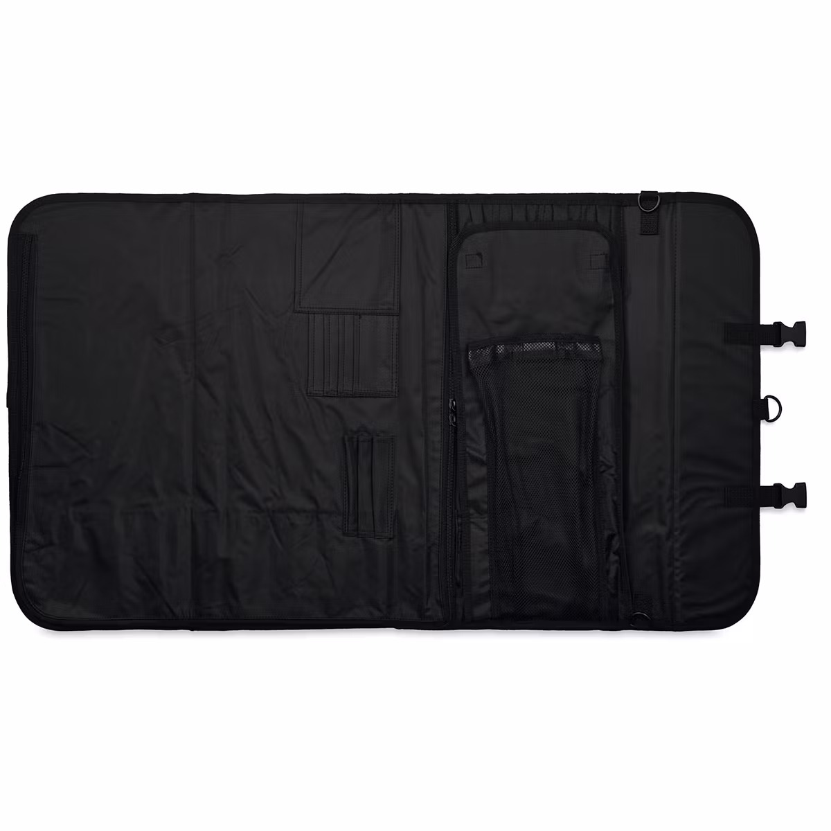Vikbar styv knivväska i slitsrark textil med plats till 9 långa knivar, 8 korta knivar/redskap + flera diverse fickor till övrigt.