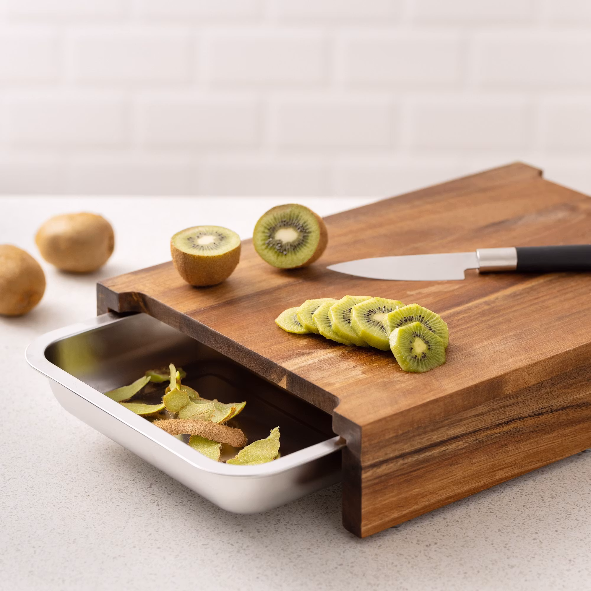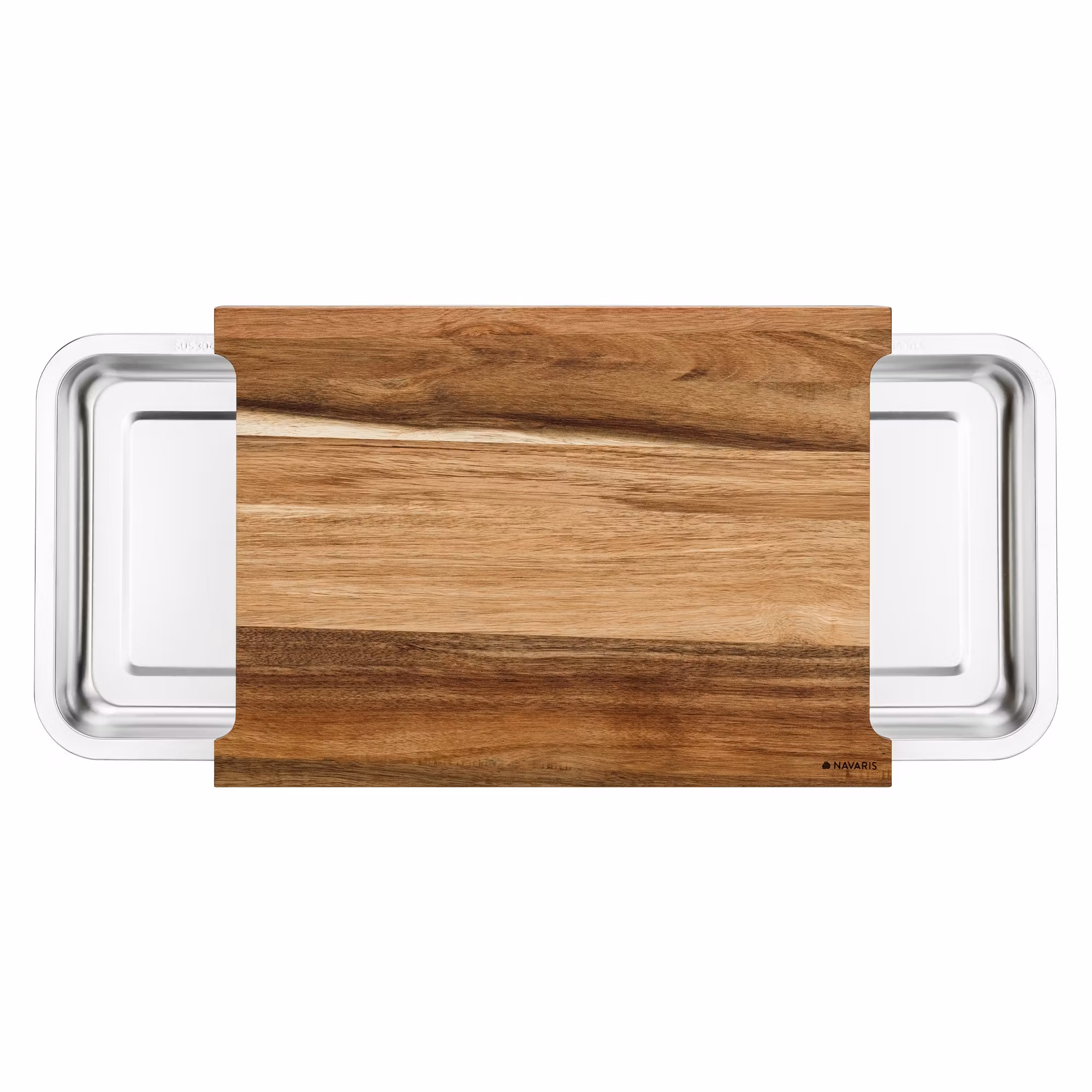 En praktisk skärbäda i akacia med 2 uppsamlingsbleck i rostfritt stål.
