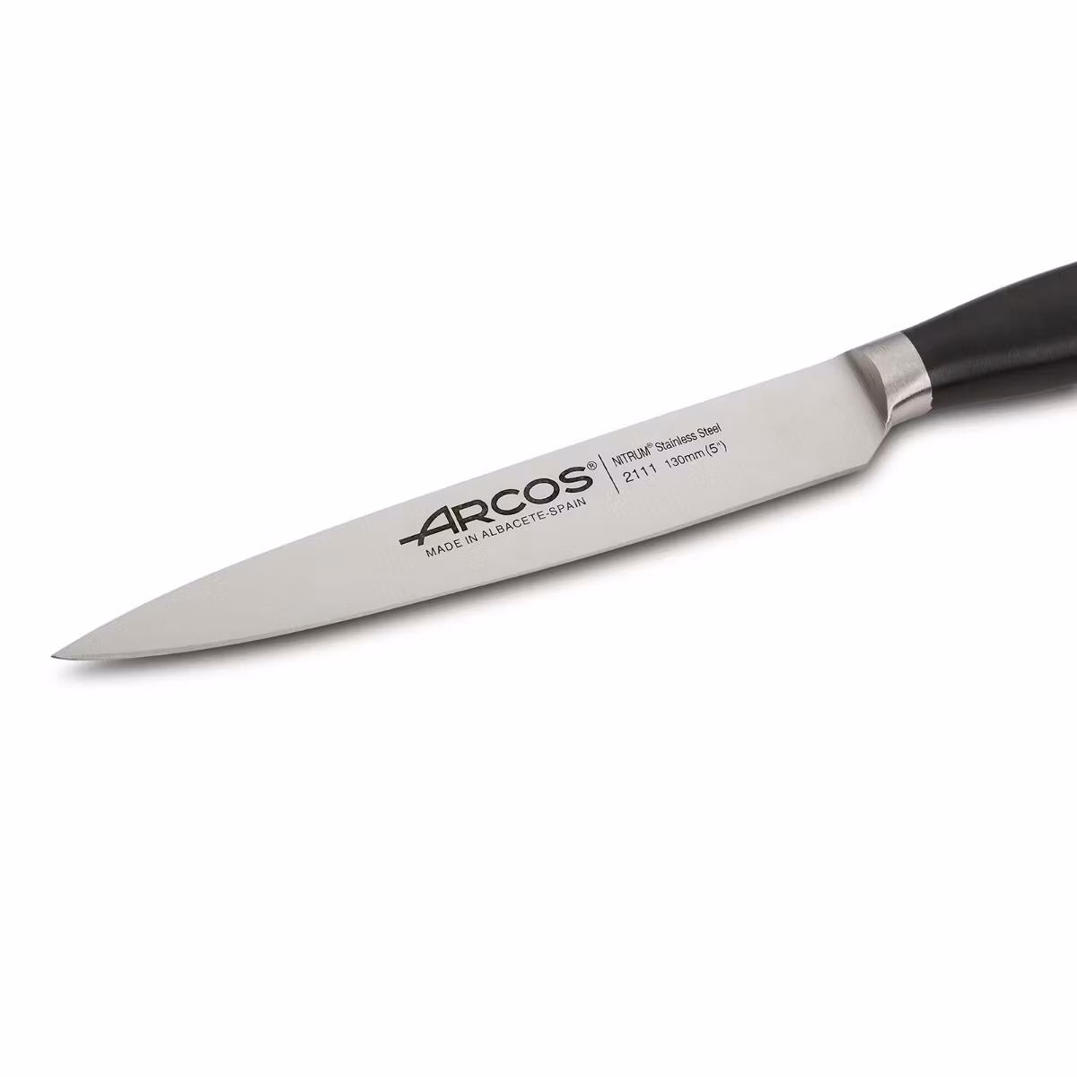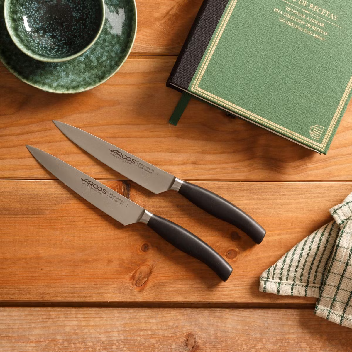 Knivarnas blad är tillverkat av Arcos egna NITRIUM®-stål som är en rostfri och härdat formel berikad med kväve för extra hårdhet och långvarig skärpa. De ergonomiska handtagen gjorda av formsprutat polypropen (PP) som injiceras i flytande tillstånd och hårdnar runt knivens tång