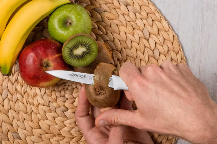 Kniven är tillverkad i exklusivt NITRUM®-stål, utvecklat av Arcos för att ge extra lång hållbarhet och skärpa. Bladet är vasst och tunt, vilket gör det lätt att arbeta nära ytan eller följa fruktens form. Det ergonomiska handtaget är tillverkat i slitstark och hygienisk polyoxymetylen (POM), ett material som tål både fukt, höga temperaturer och daglig användning.