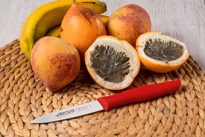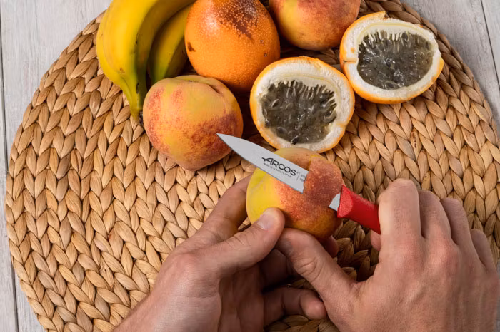 Kniven är tillverkad i exklusivt NITRUM®-stål, utvecklat av Arcos för att ge extra lång hållbarhet och skärpa. Bladet är vasst och tunt, vilket gör det lätt att arbeta nära ytan eller följa fruktens form. Det ergonomiska handtaget är tillverkat i slitstark och hygienisk polyoxymetylen (POM), ett material som tål både fukt, höga temperaturer och daglig användning.