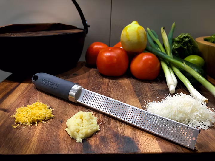 Detta är det perfekta rivjärnet (även kallat zestjärn). Små fina knivspetsar som hyvlar av fina microflager av grönsaker, frukt, ost, choklad m.m.