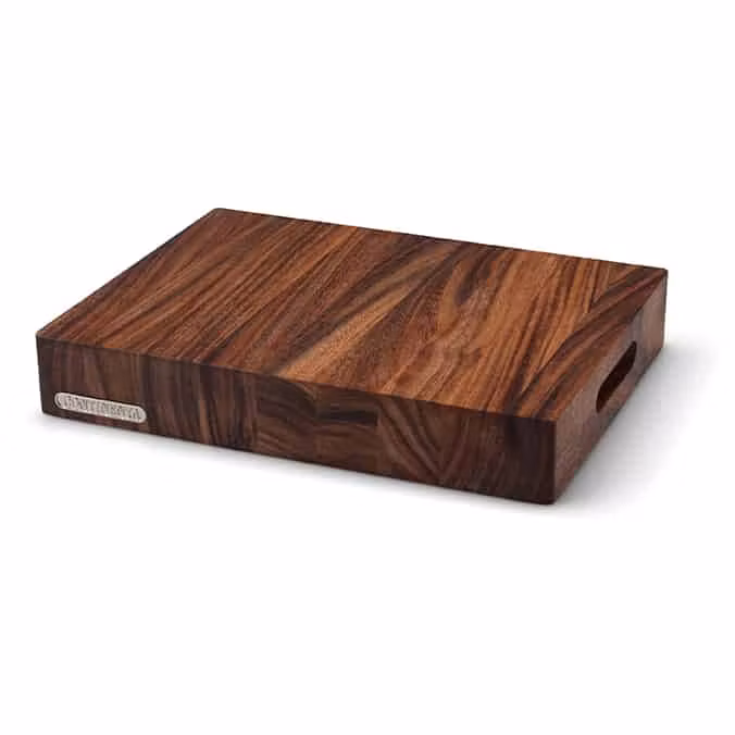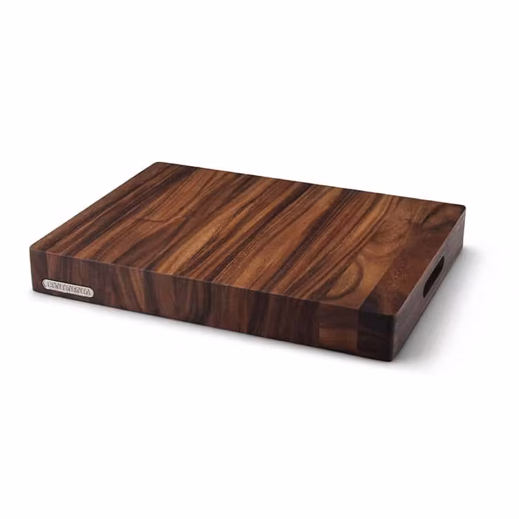 En solid och stabil skärbräda i akacia med infällda grepp på sidorna. Skärbrädan kan användas på båda sidor.