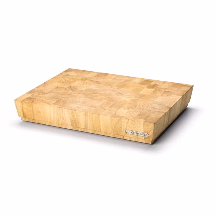 En reel och solid skärbäda i gummiträ med inåtlutande kantar för enklara att flytta mat från skärbräda till fat eller form utan spill på köksbänken. Skärbrädan är tillverkat med ändträet upp vilket är mest skonsam för knivarna och har den längsta hållbarheten av alla träbrädor.