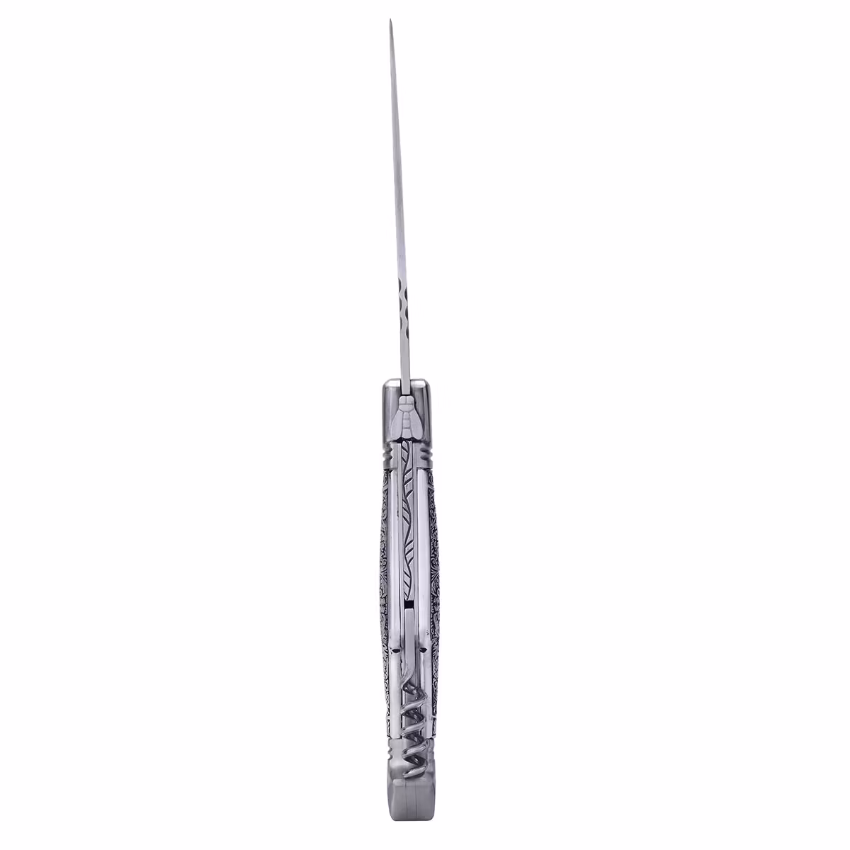 Vikbar Laguiole bordskniv & korkskruv med stålhandtag och vacker venetiansk gravyr. Karaktäristisk bi-dekoration på knivens bolster.