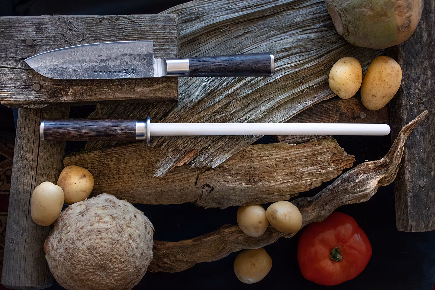 Kuro är en serie hamrade knivar, knivställ och detta suveräna bryne. Det långa skaftet av bränt trä med bolster och skaftände av 18/8-stål ger perfekt grepp, balans och stabilitet.