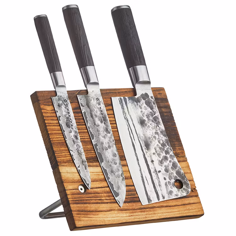 Knivset med Satake Kuro Santoku 18 cm, Satake Kuro Allkniv 15 cm och den populära Satake Kuro Köttyxa. Du får också med ett magnetiskt knivställ.