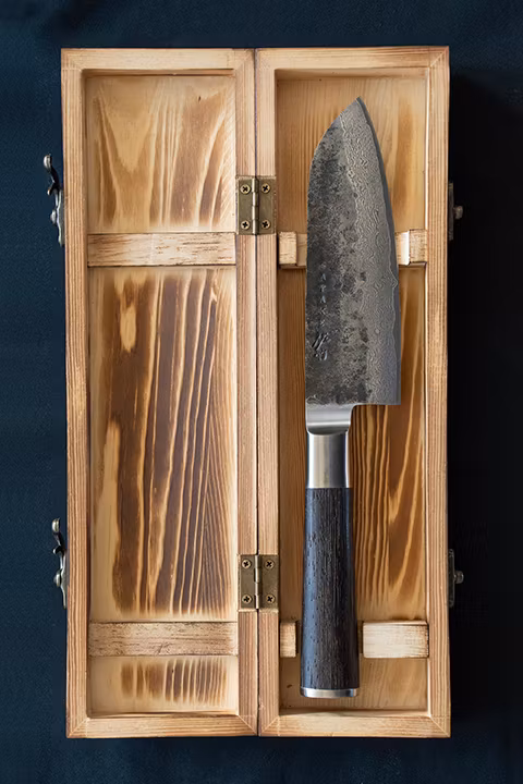 Kuro är en grovt hamrad kniv med ett blad av VG-10-stål som är processat åtta gånger vilket ger extra skärpa och en hårdhet på ca 58 HRC. Det långa handtaget av bränt trä med bolster och skaftände av 18/8-stål ger perfekt grepp, balans och stabilitet.