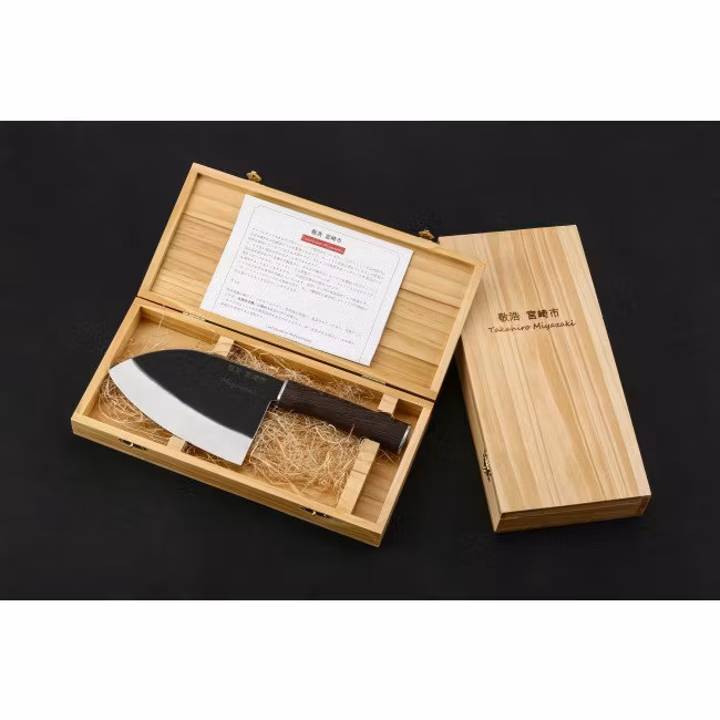 Bladen i Takahiro Miyazaki knivarna är handsmidda av japanskt Aogami kolstål (Blue Paper Steel). Detta stål, med sin höga kolhalt, är känt för sin användning i japanska svärd. Japanska knivsmeder har optimerat detta stål, som kännetecknas av att det tillåter en mycket fin skärgeometri och har en hög egghållning, för användning i köksknivar. Eftersom inget krom har tillsatts är stålet inte rostfritt utan snarare rostbeständigt. Men bara frånvaron av det relativt grovkorniga kromet gör att bladen kan slipas till en enorm skärpa, som är jämförbar med rakhyvlar.