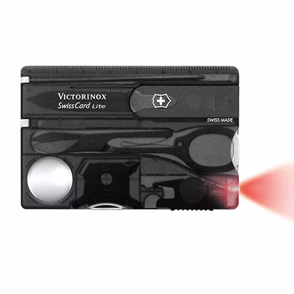 SwissCard Lite är en komplett verktygssats i kreditkortsformat. Denna tunna och behändiga verktygssats från Victorinox har 13 funktioner som du kan behöva på kontoret, i hemmet eller på resa. Vikt: 26 gr. Storlek: 81 x 53 mm.